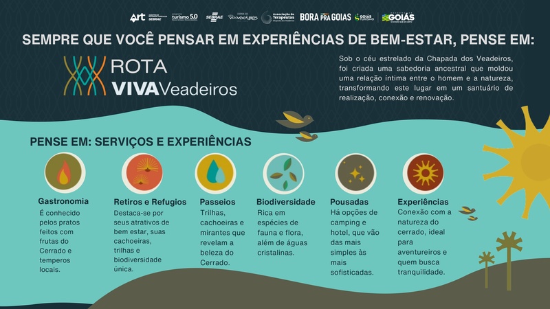 Sebrae Goiás, Goiás Turismo, Associação Veadeiros e Associação de Terapeutas lançam, em 6 de outubro, em Alto Paraíso (GO), a Rota Viva Veadeiros, um selo coletivo que organiza e promove experiências de saúde e bem-estar na Chapada dos Veadeiros. A aposta é posicionar o destino no radar nacional e internacional do chamado turismo de bem-estar, com oferta que combina trilhas, cachoeiras, pousadas que acolhem, terapias integrativas, gastronomia consciente e práticas culturais. Autoridades locais (governo de Goiás) e nacionais (Embratur e Ministério do Turismo) estão confirmadas no lançamento da Rota. A Associação Veadeiros é a gestora oficial da Rota.
