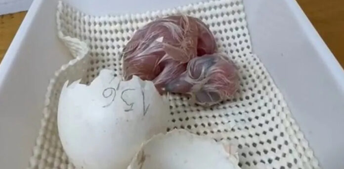 Os ovos foram incubados artificialmente, em ambiente com controle de umidade e temperatura -estratégia adotada para garantir o sucesso reprodutivo quando os animais são inexperientes ou fazem parte de espécies ameaçadas.