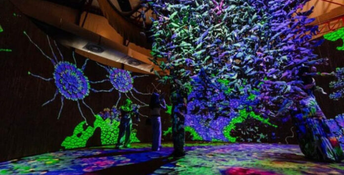 As paredes de fibra natural e a projeção de animais de miriti criam uma atmosfera sensorial que remete aos ecossistemas conectados em redes de interação e cuidado.